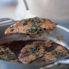 In the same fry pan over medium-high heat, melt the remaining 1 Tbs. butter. Add half of the gremolata and cook, stirring constantly, for 1 minute. Add the wine and stir, scraping up the browned bits from the pan bottom. Cook the sauce until reduced by half, about 2 minutes. Stir in the reserved lemon juice and season with salt and pepper.