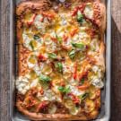 You can use either purchased or homemade pesto in these savory sheet pan tarts that sing of summer. For a quick weeknight meal, make one or the other of the tarts, or prepare both for a casual vegetarian dinner party.