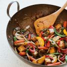 The secret to success with any stir-fry is to cook the ingredients quickly in hot oil over high heat, so always have everything you need cut, measured and next to the stovetop before you begin cooking. You can vary the vegetables here according to what you have on hand, such as trading out the yellow squash and sugar snap peas for cabbage. To do so, core 1 head of cabbage and cut it into large dice. You can also add a tangle of pea shoots or fresh herbs just before removing the pan from the heat.