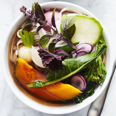 For this Vietnamese noodle soup, we’ve skipped the traditional meat and loaded ours up with a bushelful of fresh vegetables, including kabocha squash that’s roasted in the oven to bring out its natural sweetness. We’ve suggested some vegetables to use, but feel free to vary them depending on what’s fresh at your market. Vegetarians will want to skip adding the optional splash of fish sauce at the end, but others may enjoy the savory depth of flavor that it adds to this cold-weather comfort food.