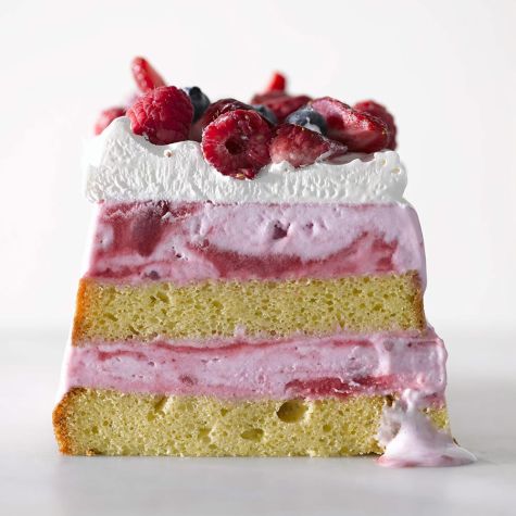 To assemble the cake, spoon half of the swirled ice cream into the prepared loaf pan and, using an offset spatula, smooth it in an even layer. Top the ice cream with the bottom layer of pound cake. Spoon the remaining ice cream into the pan and spread it evenly over the cake layer. Top the ice cream with the second cake layer. Cover the pan with plastic wrap and freeze until firm, at least 4 hours and up to 2 days.