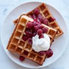 Waffles make any weekend morning special—even more so when they are topped with a bright raspberry sauce and a billow of whipped cream.