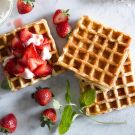 These pretty springtime waffles are a snap to prepare with our Bellegem waffle mix, then get a dose of fresh flavor with a topping of fresh strawberries and lightly sweetened whipped cream. You can substitute your favorite waffle recipe if you prefer.