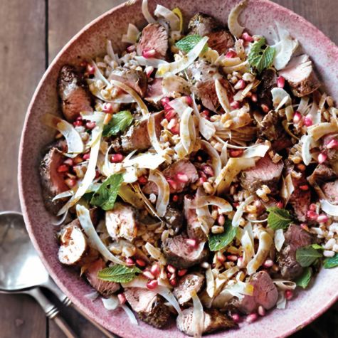 Tender lamb mixes with earthy farro, sweet pomegranate seeds, aromatic mint and crunchy fennel in this main-course salad, which is a wonderful dish to serve at the first sign of spring. Lamb tenderloin is an extremely tender cut—almost like butter—but because of its small size, care must be taken not to overcook it. It is a special-order item in most butcher shops but is well worth seeking out.
