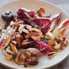 Fry bacon until crisp and brown, and then warm sherry vinegar in the same pan to form a salty-smoky vinaigrette for autumn mushrooms. Bitter radicchio and peppery arugula are layered with the warm mushroom mixture for extra flavor, color and crunch.