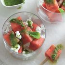 Place the watermelon and cheese in individual bowls and drizzle with the vinaigrette. Garnish with the remaining 1/4 cup mint leaves and serve immediately. Serves 6.