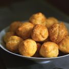 Here, French gougères, traditionally made with Gruyère cheese, get a makeover with white Cheddar cheese and chives. If you like, these can be baked ahead, cooled to room temperature and then frozen in resealable plastic bags. To reheat, simple place on a wire rack in a 350ºF (180ºC) oven and heat until warmed through.