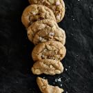 Sprinkle the flour mixture over the butter mixture and stir in with a rubber spatula until almost completely blended, with only 2 or 3 small flour streaks visible. Stir in the blond chocolate feves and macadamia nuts, scooping to the bottom of the bowl to combine all the ingredients, until the dough no longer looks dusty. If the dough seems warm or overly glossy, refrigerate for 5 minutes. Using about 3 Tbs. dough for each cookie, roll the dough into balls. Place on the prepared baking sheets, spacing the cookies about 3 inches (7.5 cm) apart. Sprinkle the tops of the cookies with flaky sea salt.