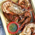 Brush the grilled lobsters with the remaining garlic-lemon butter and transfer to a platter. Garnish with the grilled lemon slices and serve immediately. Serves 4.