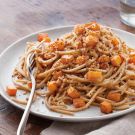 Pleasantly firm to the bite, whole-wheat spaghetti, called bigoli in Italy, combines beautifully with a sauce of caramelized onions. A new twist on this classic flavor match is this topping of roasted diced winter squash. Whole-wheat linguine can be used in place of the spaghetti.