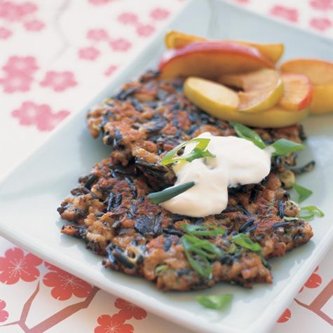 These nutty pancakes, which are delicious with a side of sautéed apples or applesauce, also make a nice side dish for roasted chicken or turkey. If you like, you can substitute 1 1/2 cups packaged blended rice mixture for the wild and brown rices in this recipe.