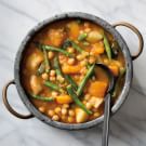 Drain the chickpeas. In a Dutch oven or a stockpot, combine the chickpeas, 3 quarts (3 l) cold water and the bay leaf and bring to a boil. Reduce the heat to medium-low and simmer until the chickpeas are almost tender, about 45 minutes. (The cooking time can vary significantly depending on how old the beans are and how hard your water is, so check them frequently.) Add the potatoes and butternut squash and cook for 15 minutes longer. Add the pears and green beans and cook until both are tender, 4 to 6 minutes.