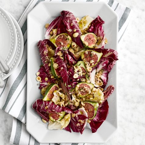 To serve, layer half of the radicchio on a serving platter. Scatter with some of the figs and hazelnuts and repeat the layering. Spoon over extra vinaigrette and serve the rest on the side. Serves 4 to 6.