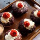 Serve the burgers on the tawa biscuits on a wooden platter, each slathered with the buffalo mayonnaise and topped with a “cherry on top” (the tomatoes with a piece of vine still attached). Garnish with micro sprouts. Serves 6.