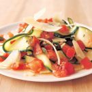Pasta-like ribbons of garden-fresh zucchini, a tangy raw tomato sauce and thin shavings of Parmigiano cheese give this familiar ingredient combination new life. Try to find Parmigiano-Reggiano straight from Italy, which will lend an especially nutty taste to this dish.