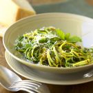 My husband made this for me for my birthday dinner with friends. The flavor is great, a fresh twist on pesto. He did edit and made this into a pasta dish. He used less yellow squash/zucchini ribbons and added them along with the pesto over linguini pasta. Yummy! One day I will try to make this recipe as it is written. Note: I recommend the Williams-Sonoma pasta. It is worth it!