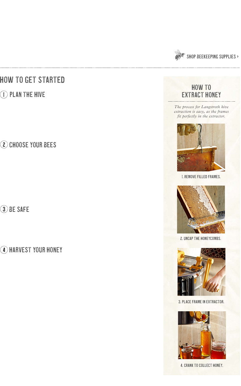 Thanks to honeybees' mild temperament and adaptability, it's possible to set up a hive nearly anywhere–even a city rooftop. Before you plan your own honeybee colony, check local ordinances covering the keeping of bees on residential property and keep in mind that the bees will need a nearby source of water, like a water fountain, birdbath or pond. If possible, it's a good idea to put up a high fence or hedge around the hive so bees will fly up and over people's heads on their way to pollinate plants. We offer beekeeping essentials, including easy-to-assemble beehives and a starter kit.