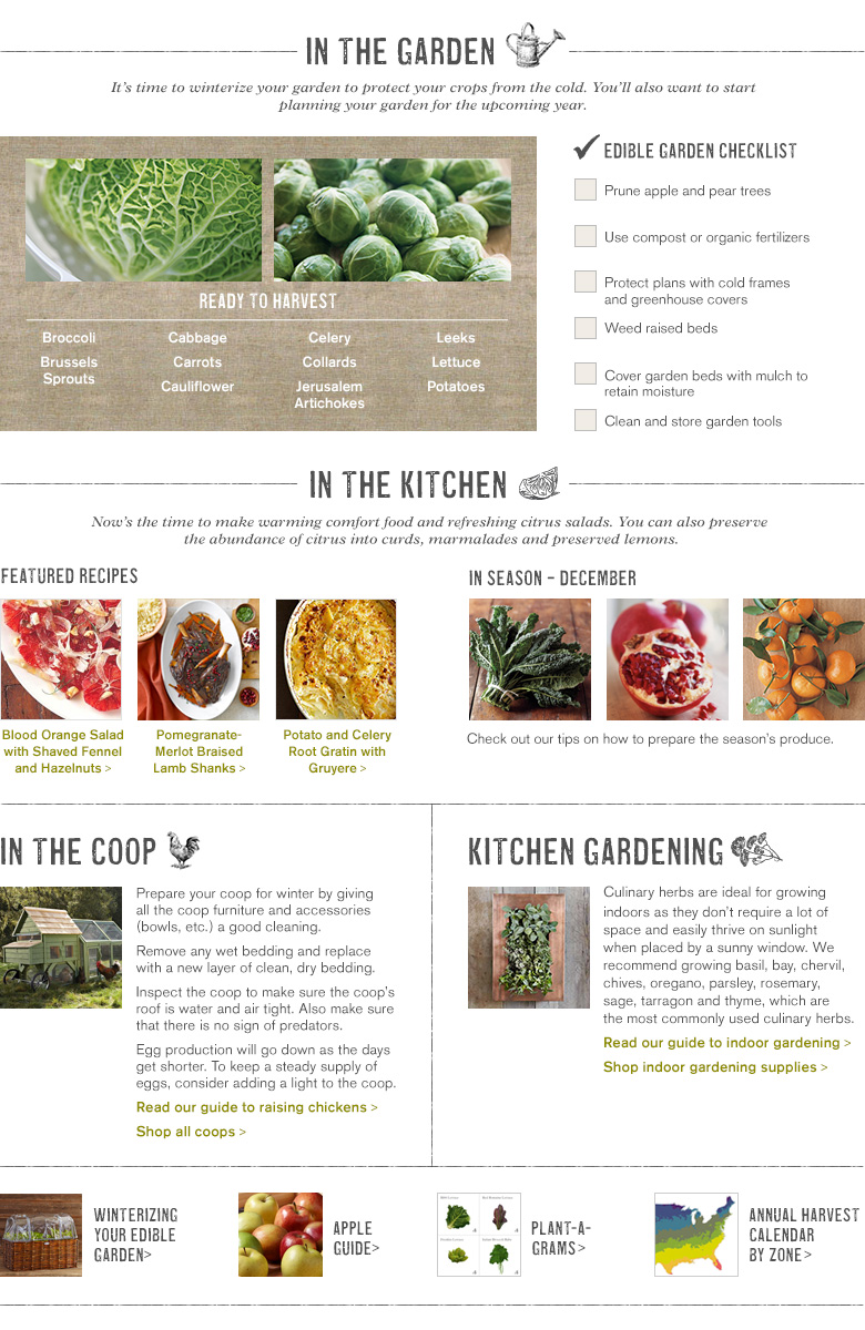 Blood Orange Salad with Shaved Fennel and Hazelnuts Pomegranate-Merlot Braised Lamb Shanks Potato and Celery Root Gratin with Gruyère In Season - December Guide to Raising Chickens Shop All Coops Guide to Indoor Gardening Shop Indoor Gardening Supplies Winterizing Your Edible Garden Apple Guide Plant-A-Grams Annual Harvest Calendar By Zone