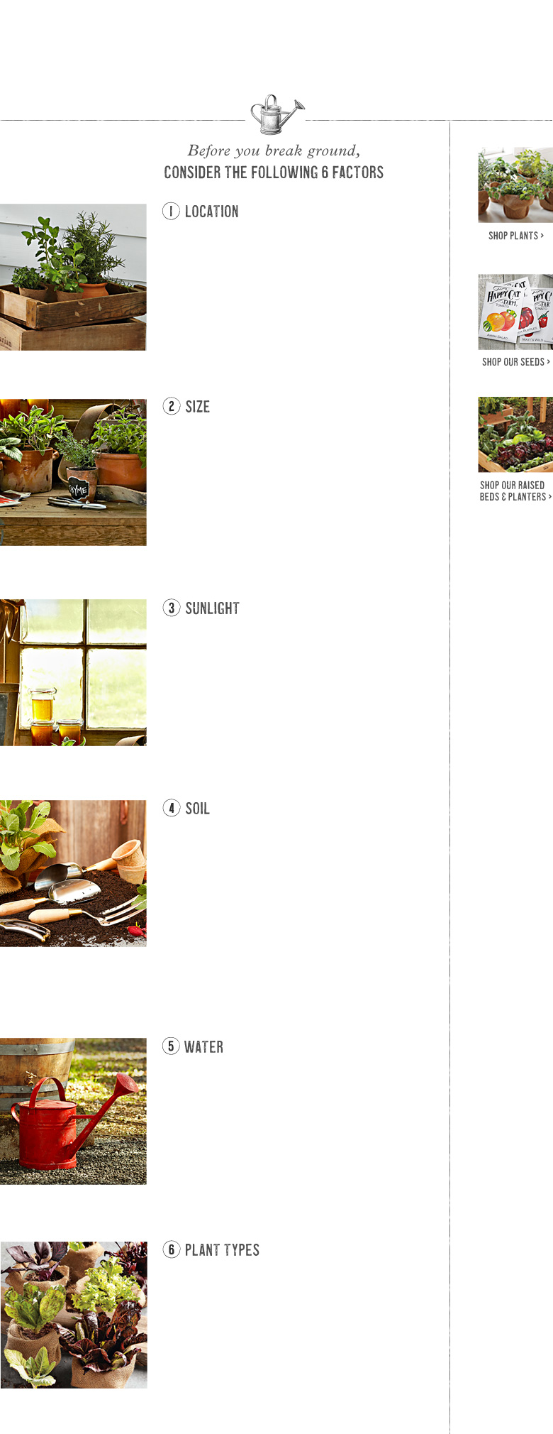 Choose a spot close to the kitchen if possible, especially for growing herbs, so you can easily snip and harvest for cooking. If there is no nearby space for a ground plot or raised beds, containers set on a patio or deck are a good option. Herbs and some small plants can also be grown in pots on a sunny windowsill.