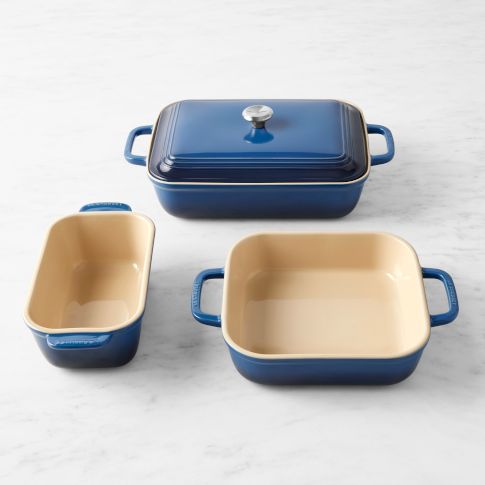 One of the most important rooms in the home, the kitchen is where much of magic happens. Taking ingredients from scratch and turning them into wonderful meals for yourself, your friends and your family is a fun and satisfying task rewarded with togetherness over the dinner table. To cook confidently and comfortably in your kitchen, however, you have to enjoy your surroundings. Having professional-grade items at your disposal to help make cooking and cleanup easier definitely makes cooking more enjoyable. Color coordinating your kitchen also not only adds cheer to the room but turns it into a space where you enjoy spending your time. Adding blue cookware, kitchenware and baking tools when you’re trying to accent or complement a blue hue that’s already present keeps your space joyful and bright. Look to us at Williams-Sonoma for items in different shades of blue to completely decorate your space, from spatulas to skillets. Look for ovenware, bakeware and cookware in blue hues to complement everything from your curtains to your kitchen rug.