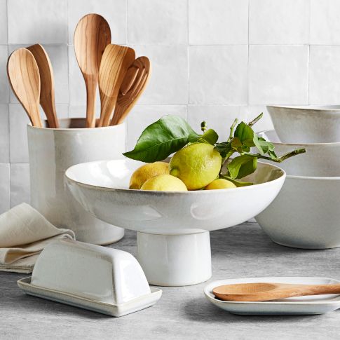 - Covered dishes offer a vintage appeal that helps balance the forward-thinking aesthetic of an all-white kitchen.