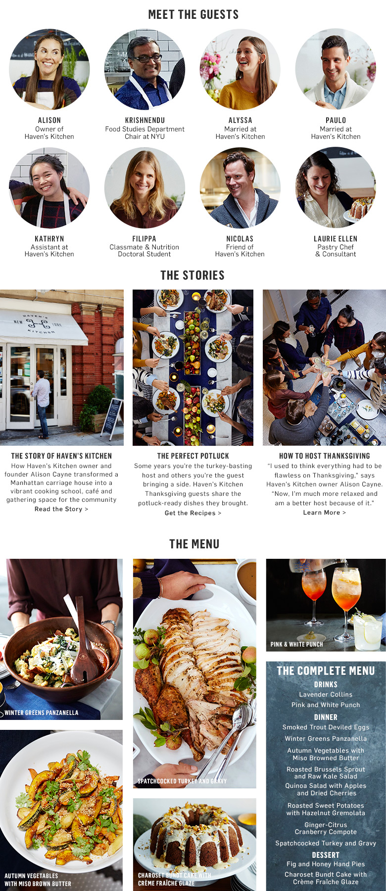 Thanksgiving with Friends at Havens Kitchen Watch the Video The Story of Haven's Kitchen The Perfect Potluck How to Host Thanksgiving Winter Greens Panzanella Autumn Vegetables with Miso Brown Butter Spatchcocked Turkey and Gravy Charoset Bundt Cake with Crème Fraîche Glaze Pink and White Punch Lavender Collins Pink and White Punch Smoked Trout Deviled Eggs Winter Greens Panzanella Autumn Vegetables with Miso Brown Butter Roasted Brussels Sprout and Raw Kale Salad Quinoa Salad with Apples and Dried Cherries Roasted Sweet Potatoes with Hazelnut Gremolata Ginger-Citrus Cranberry Compote Spatchcocked Turkey and Gravy Fig and Honey Hand Pies Charoset Bundt Cake with Crème Fraîche Glaze