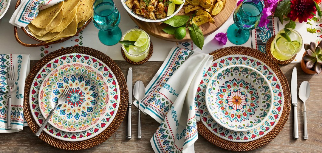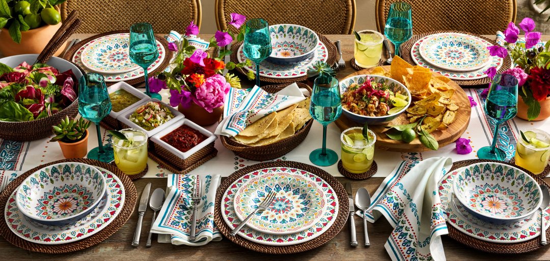 Set the scene for dining alfresco with Marisol melamine dinnerware, featuring vibrant decorative patterns designed for festive summer gatherings.