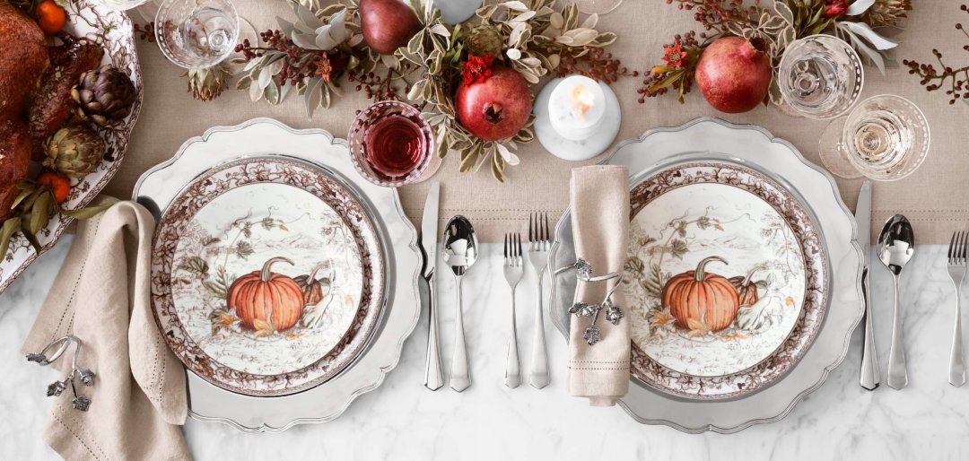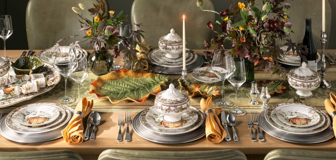 Set a festive scene with our richly detailed porcelain dinnerware, featuring oak leaf borders and timeless motifs that capture the spirit of the season.