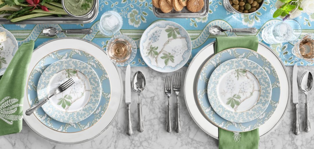 Created in collaboration with esteemed English design house Sanderson, this porcelain dinnerware collection is
